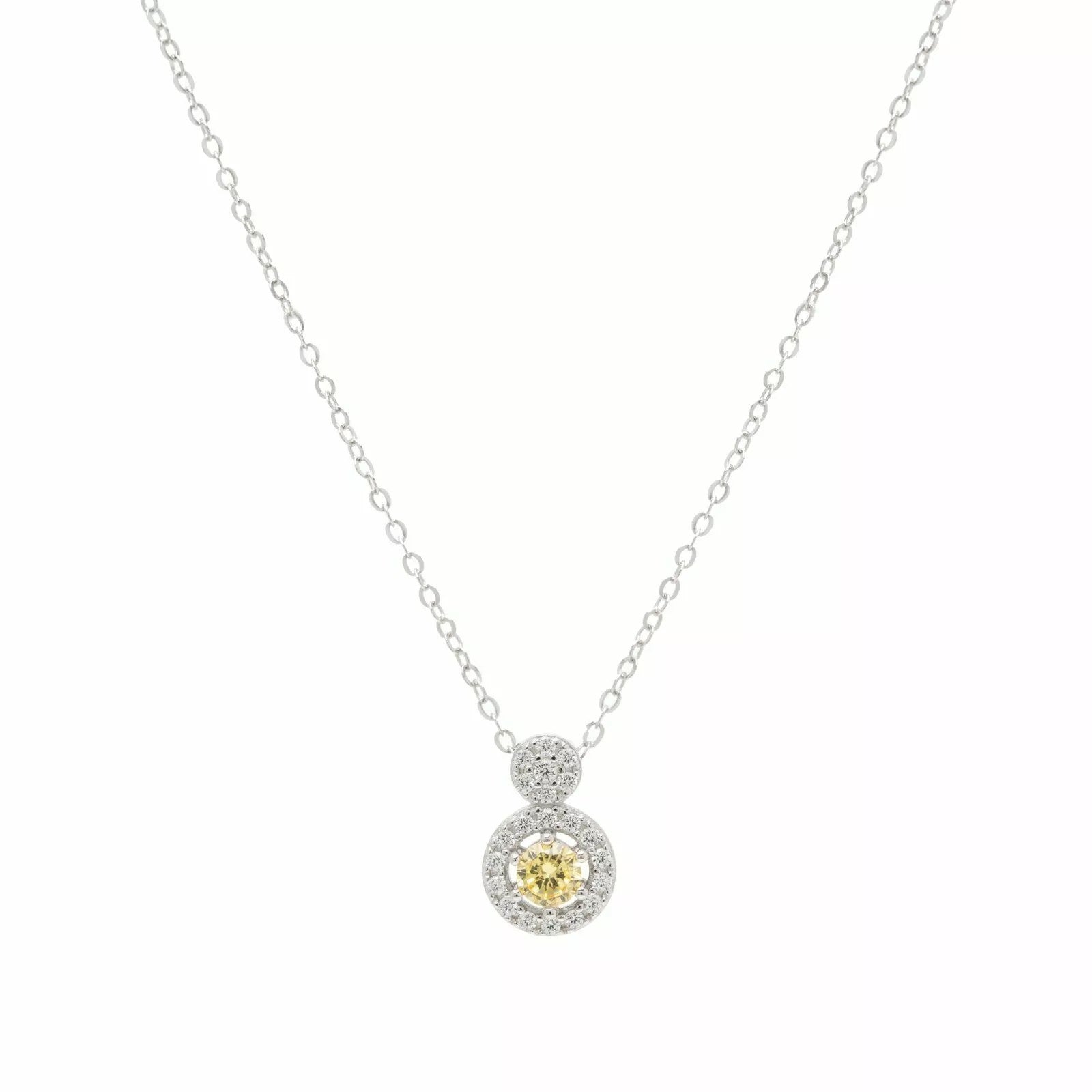 Add a touch of radiant sophistication with the Fancy Yellow Necklace from Olivia Concept. This elegant piece features a round pendant paved with white zirconia stones and highlighted at the center by a luminous fancy yellow zirconia, creating a striking yet refined contrast. Crafted in 925 sterling silver plated with white rhodium, the necklace delicately catches the light, offering a timeless sparkle that elevates any look — from everyday elegance to evening glamour.